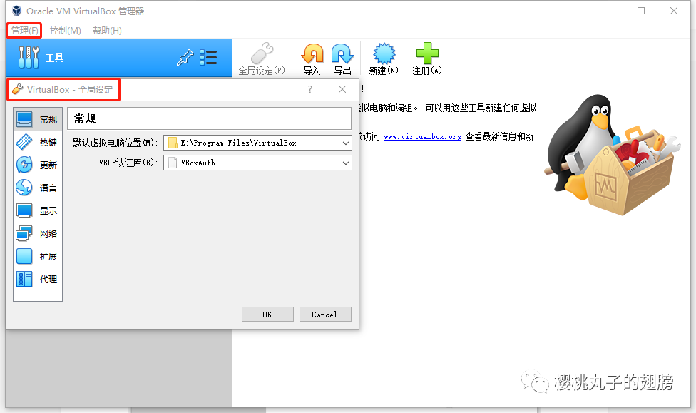 点击:管理>全局设定>配置默认虚拟电脑设置(我这里是:E:\Program Files\VirtualBox)。这里的配置是用于存放后续的系统目录。