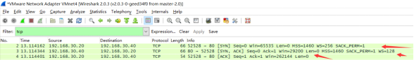 注意到“第一次握手”客户端发送的 TCP 报文中以[SYN]作为标志位,并且客户端序号 Seq=0。