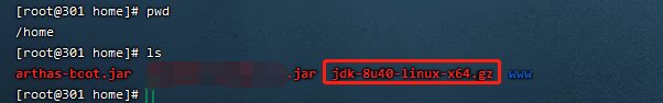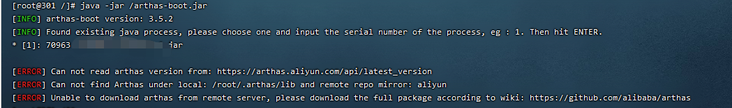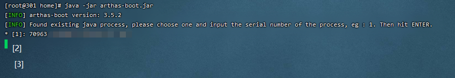 [root@301 home]# java -jar arthas-boot.jar[INFO] arthas-boot version: 3.5.2[INFO] Found existing java process, please choose one and input the serial number of the process, eg : 1. Then hit ENTER.* [1]: 70963 a.jar[2]: 70961 b.jar