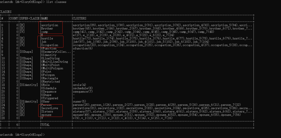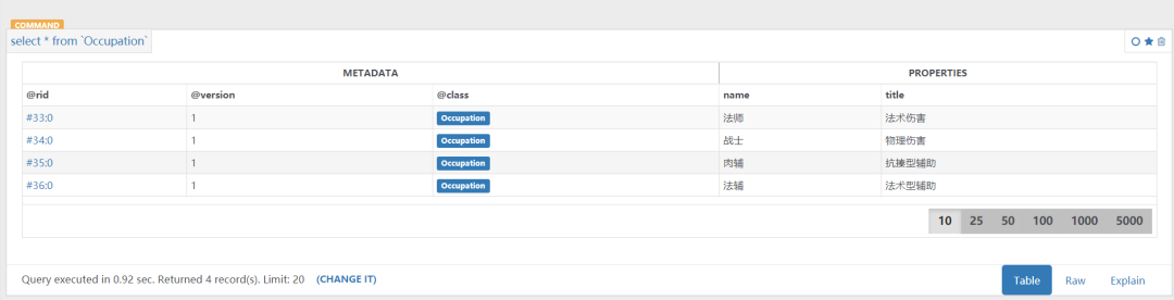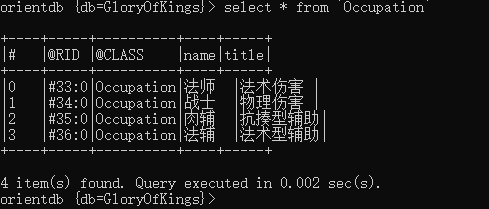 create vertex Occupation set name="法师",title="法术伤害"create vertex Occupation set name="战士",title="物理伤害"create vertex Occupation set name="肉辅",title="抗揍型辅助"create vertex Occupation set name="法辅",title="法术型辅助"