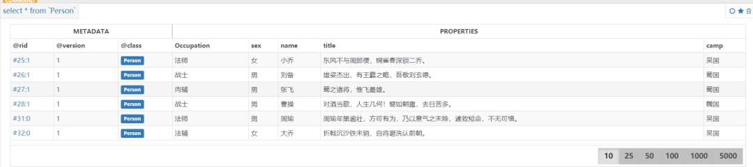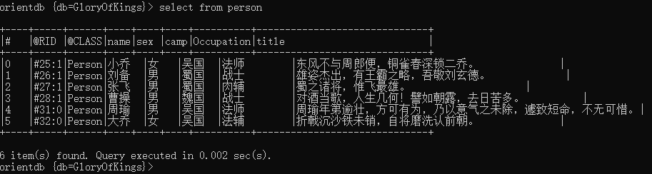 job(工作)create edge job from(select from Person where name="周瑜") to(select from Occupation where name="法师")create edge job from(select from Person where name="大乔") to(select from Occupation where name="法辅")create edge job from(select from Person where name="小乔") to(select from Occupation where name="法师")create edge job from(select from Person where name="刘备") to(select from Occupation where name="战士")create edge job from(select from Person where name="张飞") to(select from Occupation where name="肉辅")create edge job from(select from Person where name="曹操") to(select from Occupation where name="战士")
