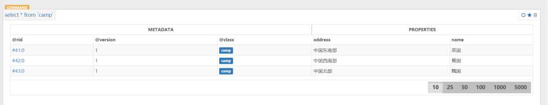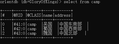 create vertex camp set name="吴国",address="中国东南部"create vertex camp set name="蜀国",address="中国西南部"create vertex camp set name="魏国",address="中国北部"