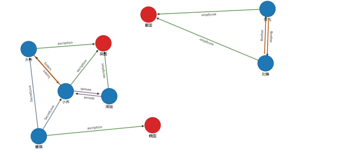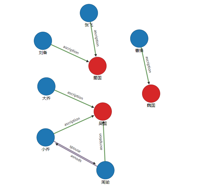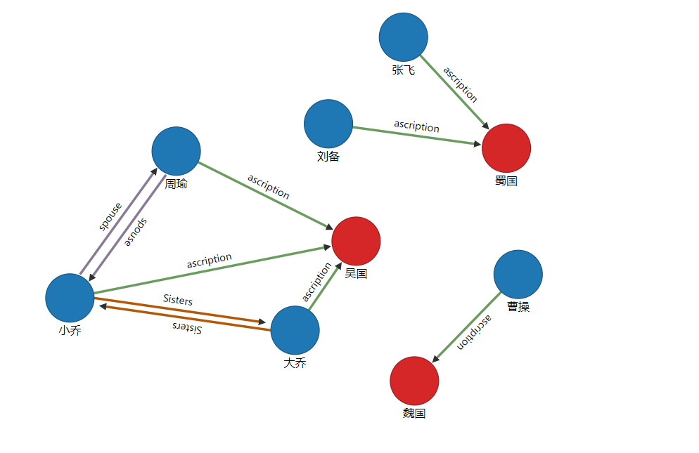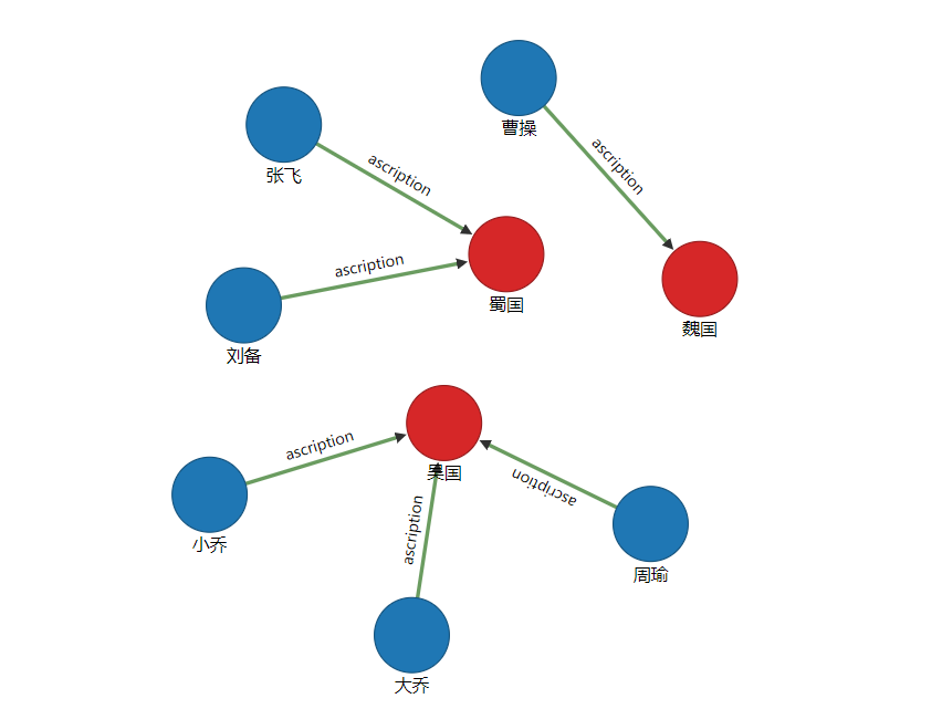 ascription(归属)create edge ascription from(select from Person where name="周瑜") to(select from camp where name="吴国")create edge ascription from(select from Person where name="大乔") to(select from camp where name="吴国")create edge ascription from(select from Person where name="小乔") to(select from camp where name="吴国")create edge ascription from(select from Person where name="刘备") to(select from camp where name="蜀国")create edge ascription from(select from Person where name="张飞") to(select from camp where name="蜀国")create edge ascription from(select from Person where name="曹操") to(select from camp where name="魏国")