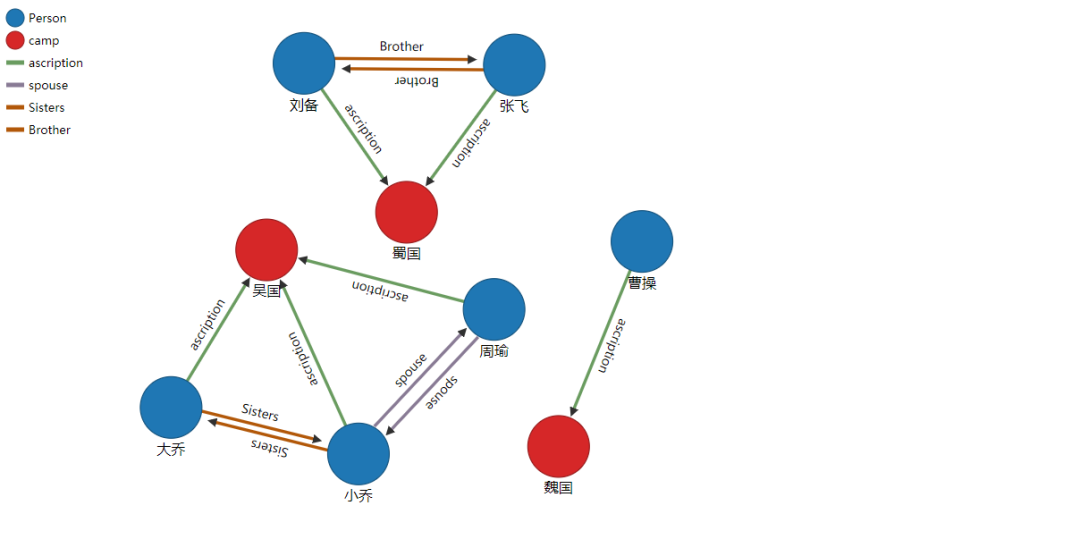 V 顶点(实体)person(英雄):周瑜,大乔,小乔,刘备,张飞,曹操Occupation(职业):法师,战士,肉辅,法辅camp(阵营):魏国,蜀国,吴国E 边缘(关系):spouse(夫妻),Sisters(姐妹),Brother(兄弟),,hostile(敌对),SecretLove(暗恋),ascription(归属),job(工作)