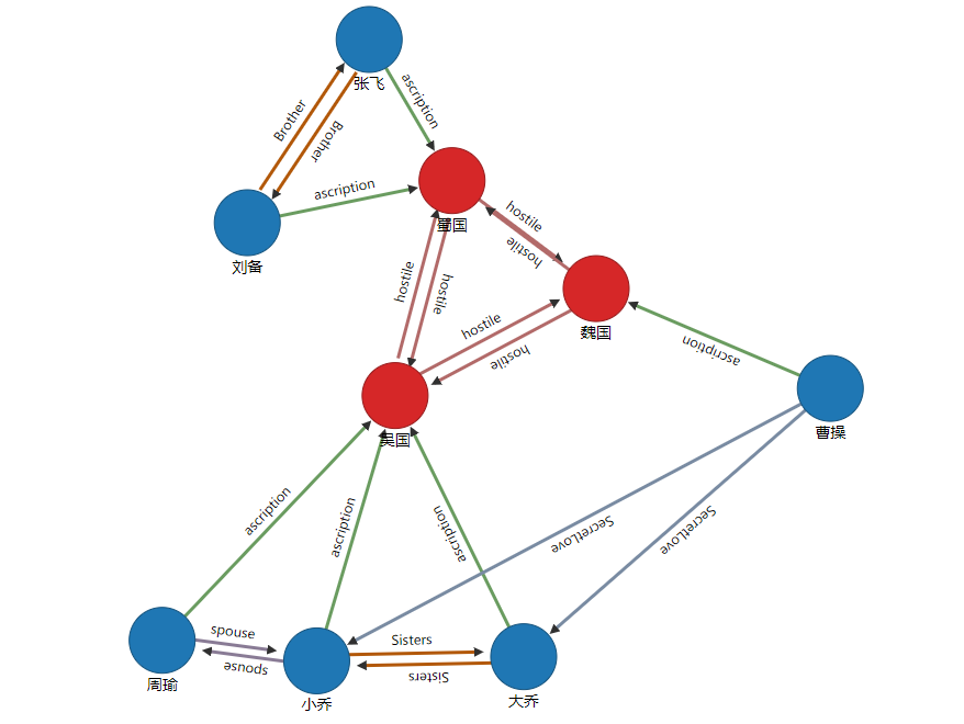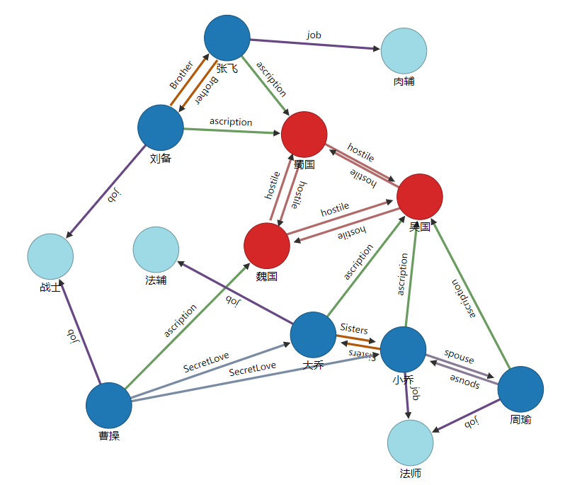 create vertex Person set name="周瑜",sex="男",camp="吴国",Occupation="法师",title="周瑜年第逾壮,方可有为,乃以意气之未除,遽致短命,不无可惜。"create vertex Person set name="大乔",sex="女",camp="吴国",Occupation="法辅",title="折戟沉沙铁未销,自将磨洗认前朝。"create vertex Person set name="小乔",sex="女",camp="吴国",Occupation="法师",title="东风不与周郎便,铜雀春深锁二乔。"create vertex Person set name="刘备",sex="男",camp="蜀国",Occupation="战士",title="雄姿杰出,有王霸之略,吾敬刘玄德。"create vertex Person set name="张飞",sex="男",camp="蜀国",Occupation="肉辅",title="蜀之诸将,惟飞最雄。"create vertex Person set name="曹操",sex="男",camp="魏国",Occupation="战士",title="对酒当歌,人生几何!譬如朝露,去日苦多。"