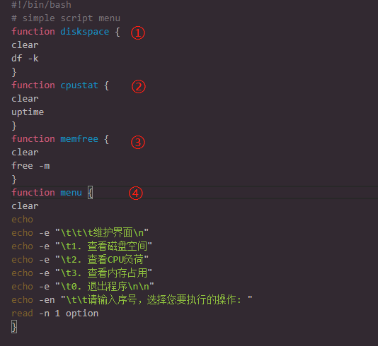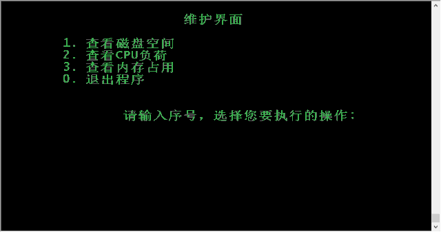 如下截图实现一个简单的菜单程序,菜单上共有四个选项,分别是查看磁盘,查看CPU负荷,查看内存占用,以及退出菜单选择。