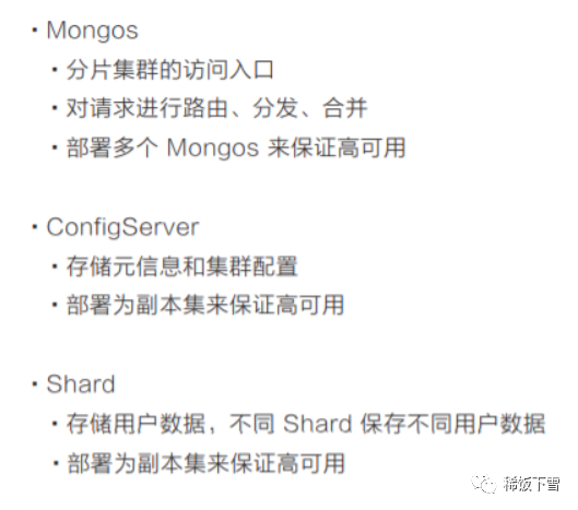 在实际生产中,一个 Shard Server 可由几台机器组成一个副本集来承担,防止因主节点单点故障导致整个系统崩溃。