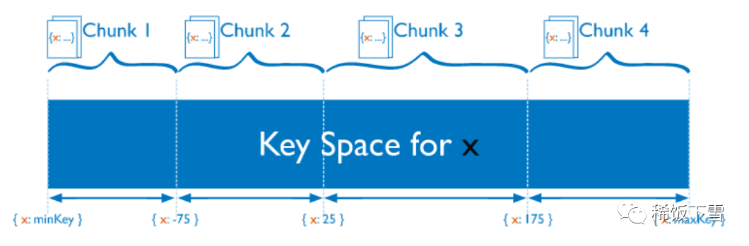 如上图所示,假设集合根据x字段来分片,x的取值范围为[minKey, maxKey](x为整型,这里的minKey、maxKey为整型的最小值和最大值),将整个取值范围划分为多个chunk,每个chunk(默认配置为64MB)包含其中一小段的数据:如Chunk1包含x的取值在[minKey, -75)的所有文档,而Chunk2包含x取值在[-75, 25)之间的所有文档...