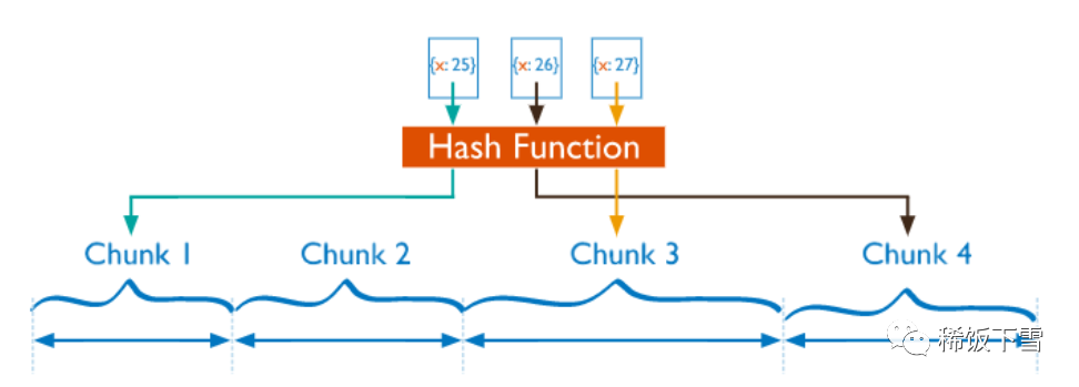 Hash分片是根据用户的 ShardKey 先计算出hash值(64bit整型),再根据hash值按照「范围分片」的策略将文档分布到不同的 chunk。由于 hash值的计算是随机的,因此 Hash 分片具有很好的离散性,可以将数据随机分发到不同的 chunk 上。