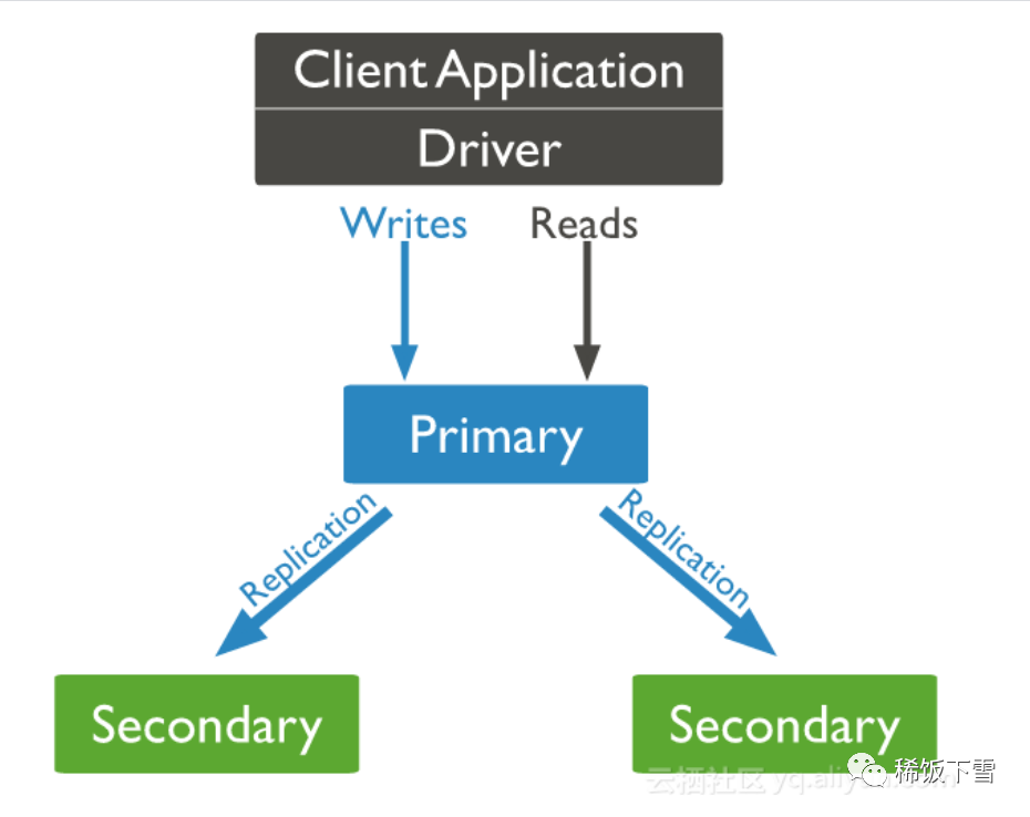副本集可以作为 Shard Cluster 中的一个Shard(片)之外,对于规模较小的业务来说,也可以使用一个单副本集的方式进行部署。MongoDB 的副本集采取了一主多从的结构,即一个Primary Node + N* Secondary Node的方式,数据从主节点写入,并复制到多个备节点。
