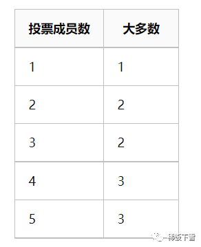 受 Raft算法的影响,主节点的选举需要满足"大多数"原则,可以参考下表:
