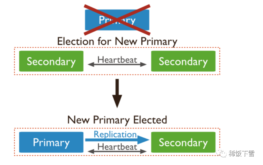 在高可用的实现机制中,心跳(heartbeat)是非常关键的,判断一个节点是否宕机就取决于这个节点的心跳是否还是正常的。副本集中的每个节点上都会定时向其他节点发送心跳,以此来感知其他节点的变化,比如是否失效、或者角色发生了变化。利用心跳,MongoDB 副本集实现了自动故障转移的功能,如下图: