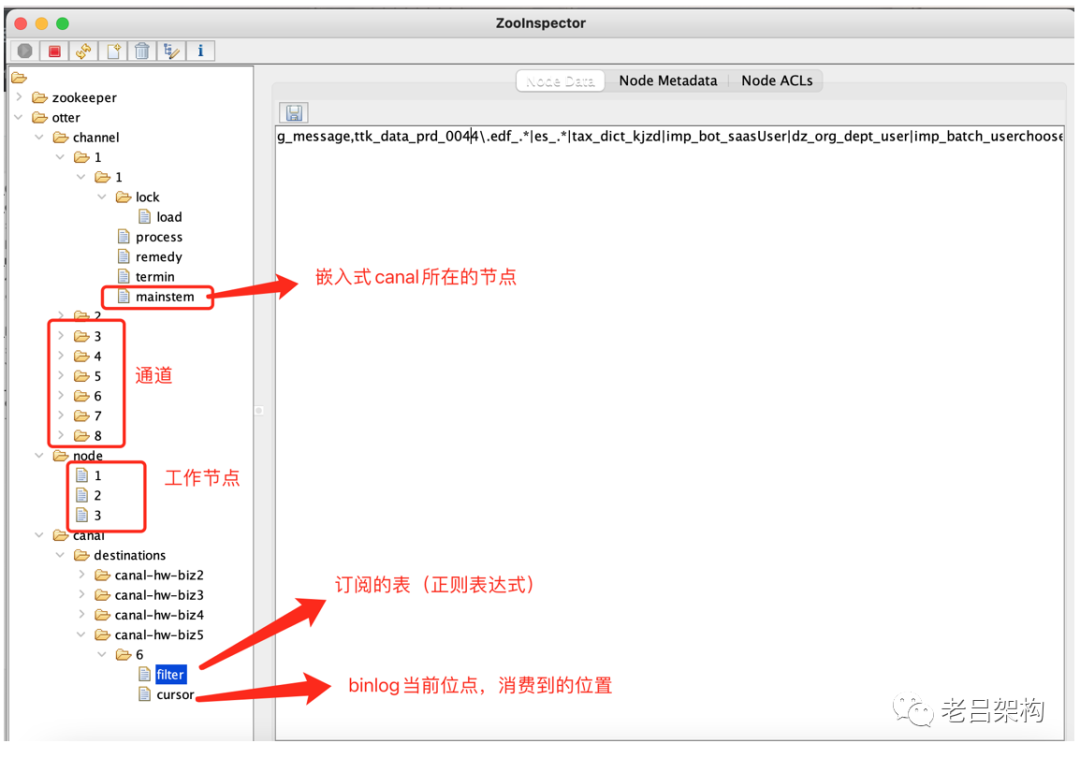 解析关注的表,Perl正则表达式.多个正则之间以逗号(,)分隔,转义符需要双斜杠(\)常见例子:1. 所有表:.* or .*\..*2. canal schema下所有表:canal\..*3. canal下的以canal打头的表:canal\.canal.*4. canal schema下的一张表:canal.test15. 多个规则组合使用:canal\..*,mysql.test1,mysql.test2 (逗号分隔)注意:此过滤条件只针对row模式的数据有效(ps. mixed/statement因为不解析sql,所以无法准确提取tableName进行过滤)