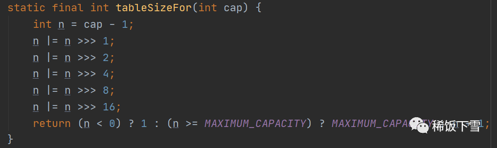 这么一坨东西是啥呢,其实就是一个算法,看不懂也莫得关系,毕竟我也看不懂,记住就好,这个算法其实就是返回大于输入参数且最近的2的整数次幂的数,比如设置的初始容量为10,那么这个算法则返回16。