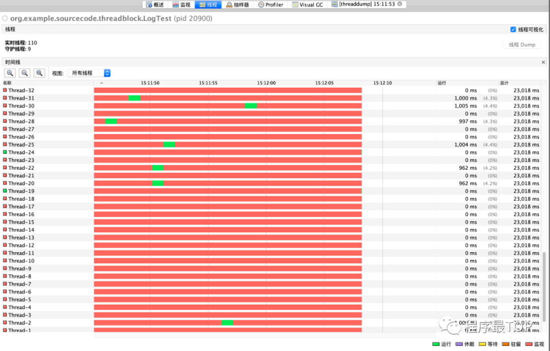 运行上面的代码,并使用jvisualvm工具来查看线程的运行状态,如下图所示:
