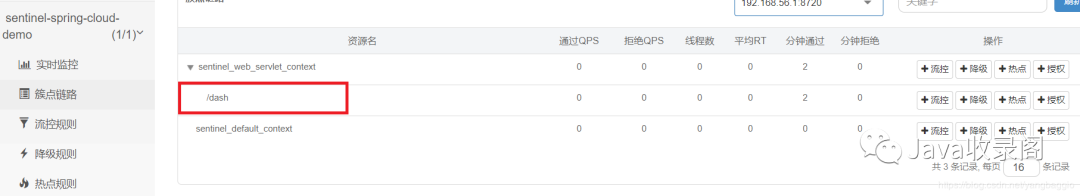 进入spring.application.name对应的菜单,访问“簇点链路”,如下图所示,在该列表下可以看到/dash这个REST接口的资源名称。