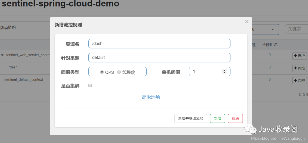 针对/dash这个资源,点击最右边的操作栏中的“流控”按钮设置流控规则,如下图所示: