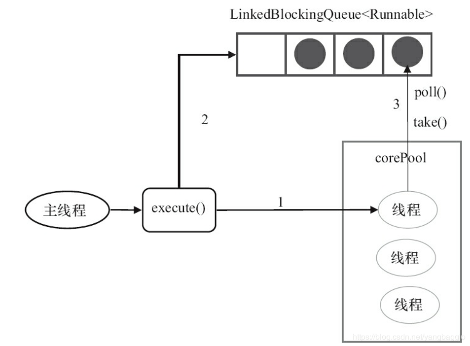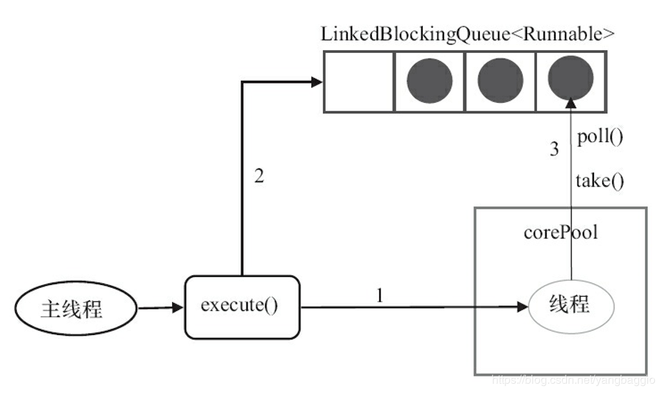 当线程执行完1中的任务后,会在循环中反复从linkedBlockingQueue中获取任务来执行
