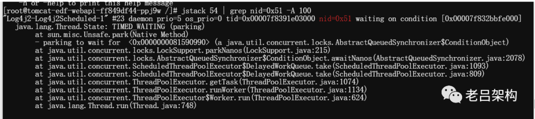 jstack 进程号 | grep nid=0x+16进制线程号 -A 100