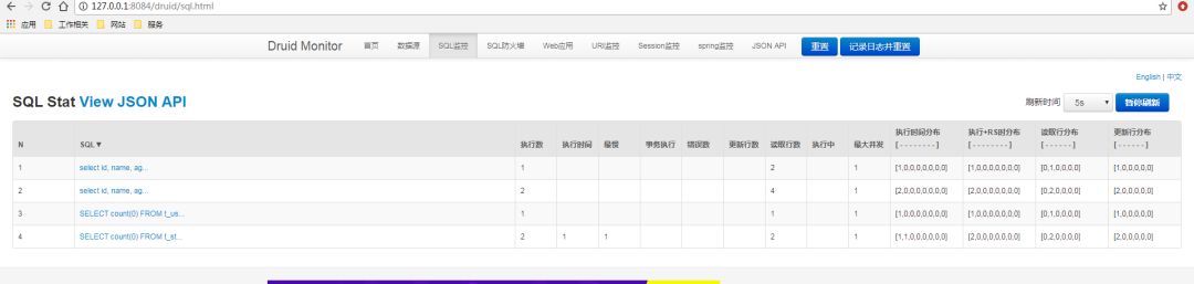 上面的配置完之后,就可以将Druid作为连接池使用了。但是Druid并不简简单单的是个连接池,它也可以说是一个监控应用,它自带了web监控界面,可以很清晰的看到SQL相关信息。