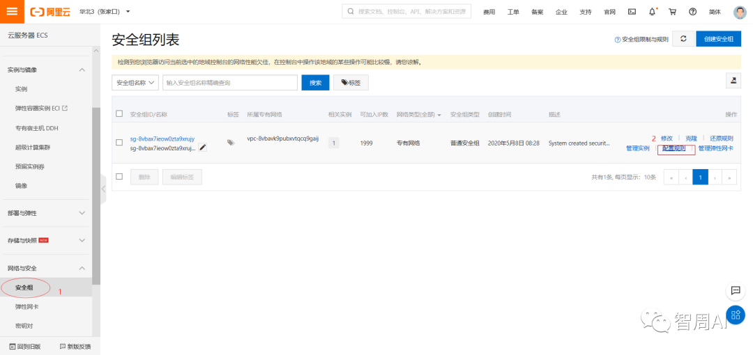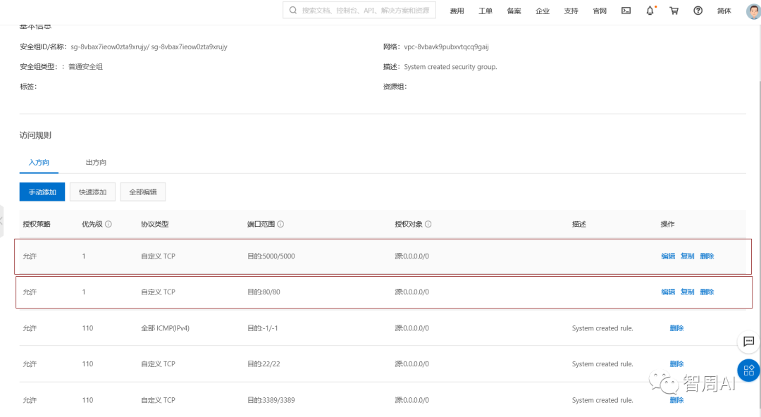 首先进入控制台,找到网络与安全模块的安全组,点击配置规则,最后添加5000端口和80端口,可以按照下图步骤进行添加: