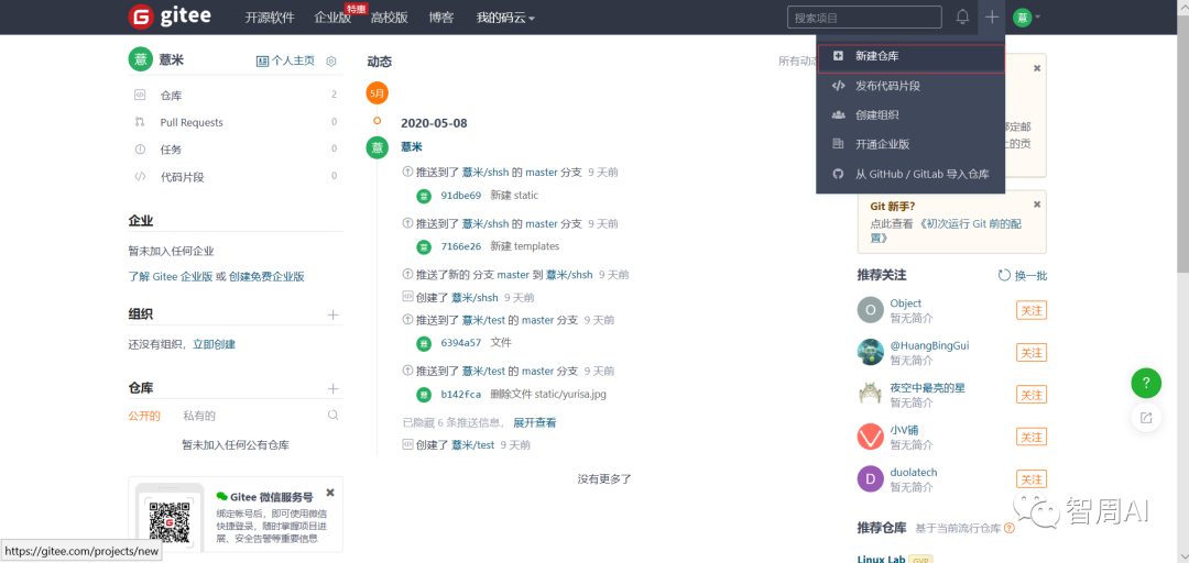 (1)申请一个码云账户进入后创建自己的仓库: