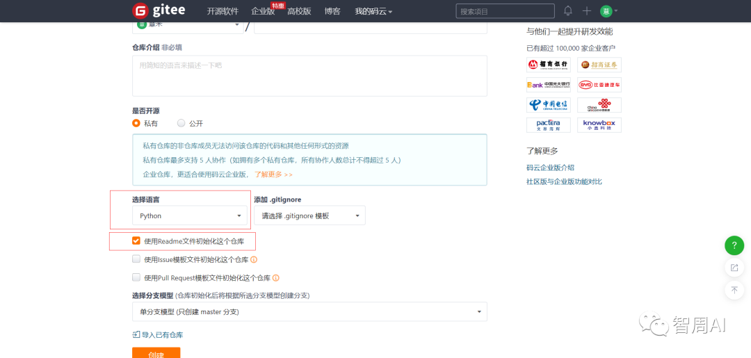 (2)选择语言为Python,并标选使用Readme文件初始化仓库: