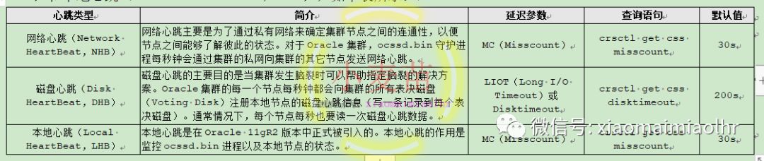 Oracle集群有3种心跳机制,分别为网络心跳(Network HeartBeat,NHB)、磁盘心跳(Disk HeartBeat,DHB)和本地心跳(Local HeartBeat,LHB),如下表所示: