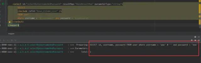 <select id="selectByUsernameAndPassword" resultMap="BaseResultMap" parameterType="string">