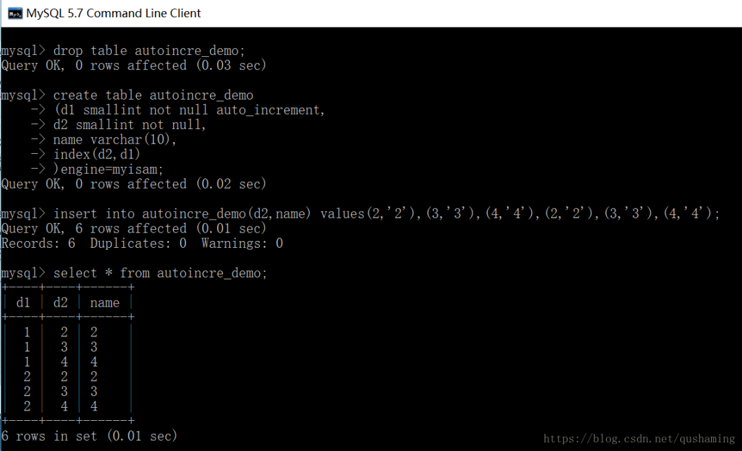 MyISAM的自动增长列可以是组合索引的其他列,这样插入记录后,自动增长列是按照组合索引的前面激烈进行排序后递增。例如创建一个新的MyISAM类型的表autoincre_demo,自动增长列d1作为组合索引第二列,插入记录后发现自动增长列是按组合索引的第一列d2进行排序后递增。