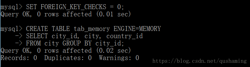当不再需要MEMORY表的内容要释放被使用的内存时,可执行DELETE FROM或TRUNCATE TABLE或整个删除表(DROP TABLE)。