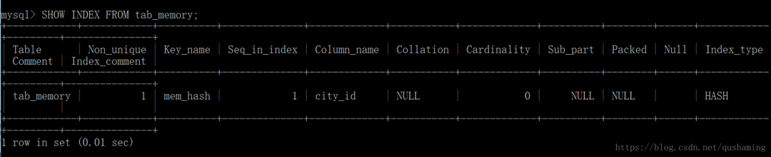 可通过SHOW INDEX FROM tab_memory;查看索引