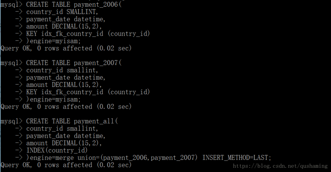 创建payment_2006、payment_2007和payment_all,其中payment_all是前两个表的MERGE表: