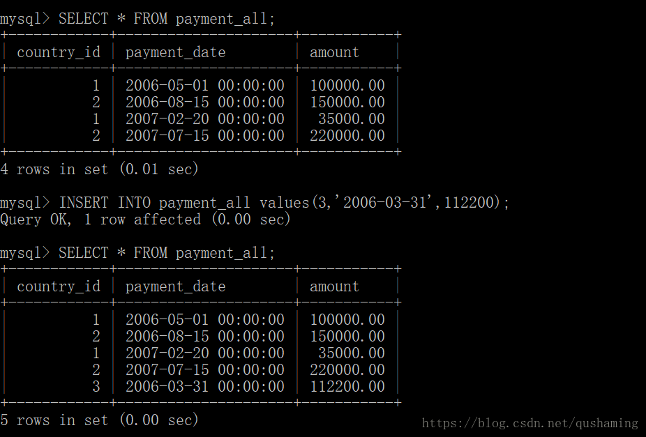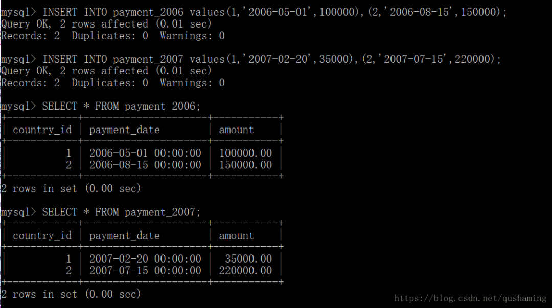 分别向payment_2006和payment_2007表插入测试数据,并分别查询3个表中的记录: