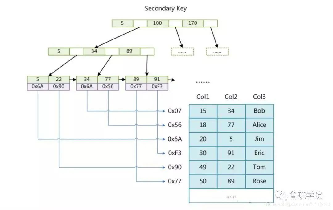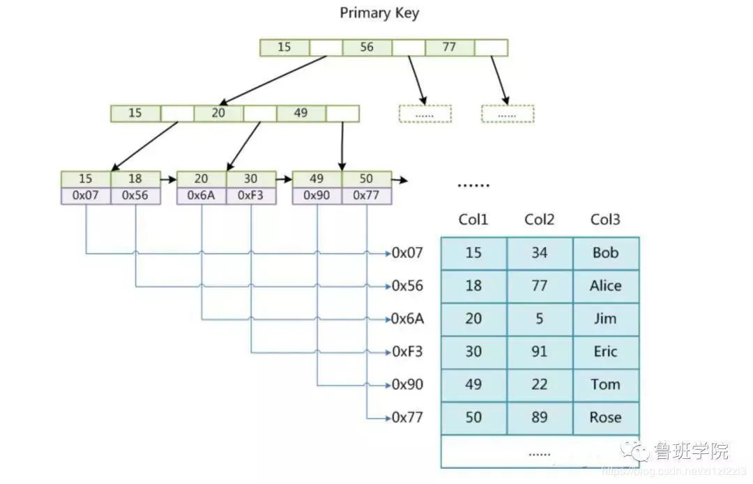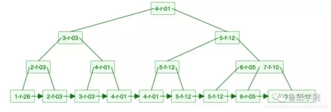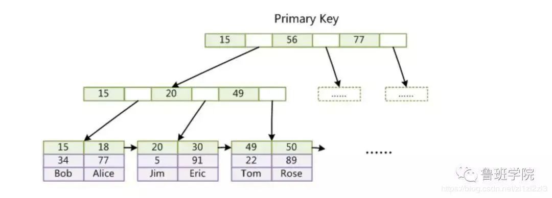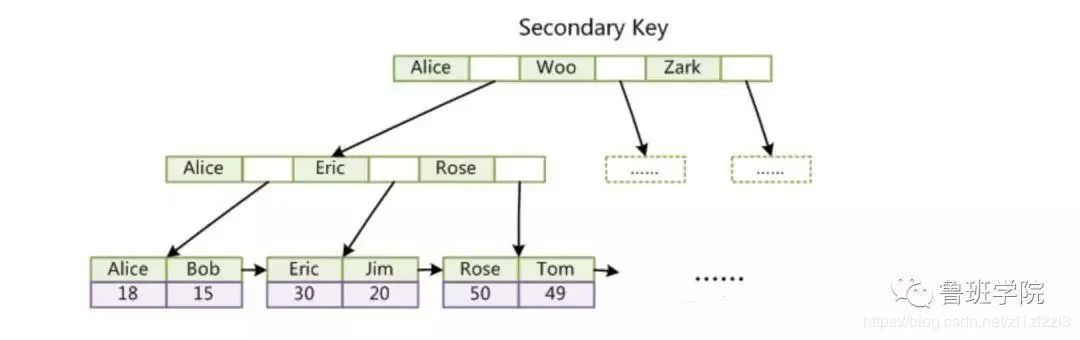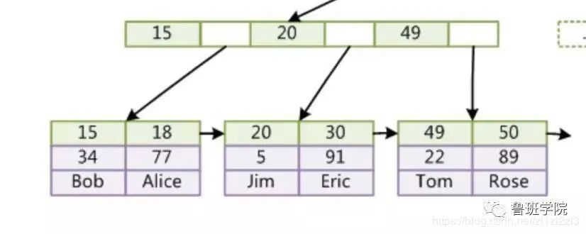 还是上面的表数据用B+树表示如下图(为了简单,数据对应的地址就不画在图中了。):