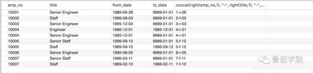 select*,concat(right(emp_no,1),"-",right(title,1),"-",right(from_date,2))from employees.titles limit10;