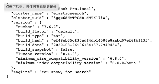 如果你的绿色背景文字部分显示的和我一样那么你就是已经连接了,我们可以点击右上角的信息,则就会显示es的基本信息。