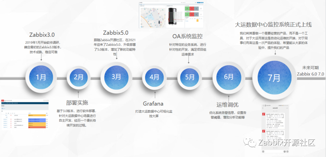 大运汽车自2019年起逐步向自动化运维方向发展,毫无疑问要面临企业级监控软件的选择,凭着多年对自动化运维理解,最终确定了基于Zabbix+Grafana的数据中心监控系统。不仅满足了对Windows、Linux操作系统、Oracle数据库、Ceph存储、Nginx等软件的监控需要,也通过Snmp、IPMI实现了服务器、交换机、存储等硬件设备的监控,还有动环系统的监测。图为大运汽车数据中心监控系统建设历程。