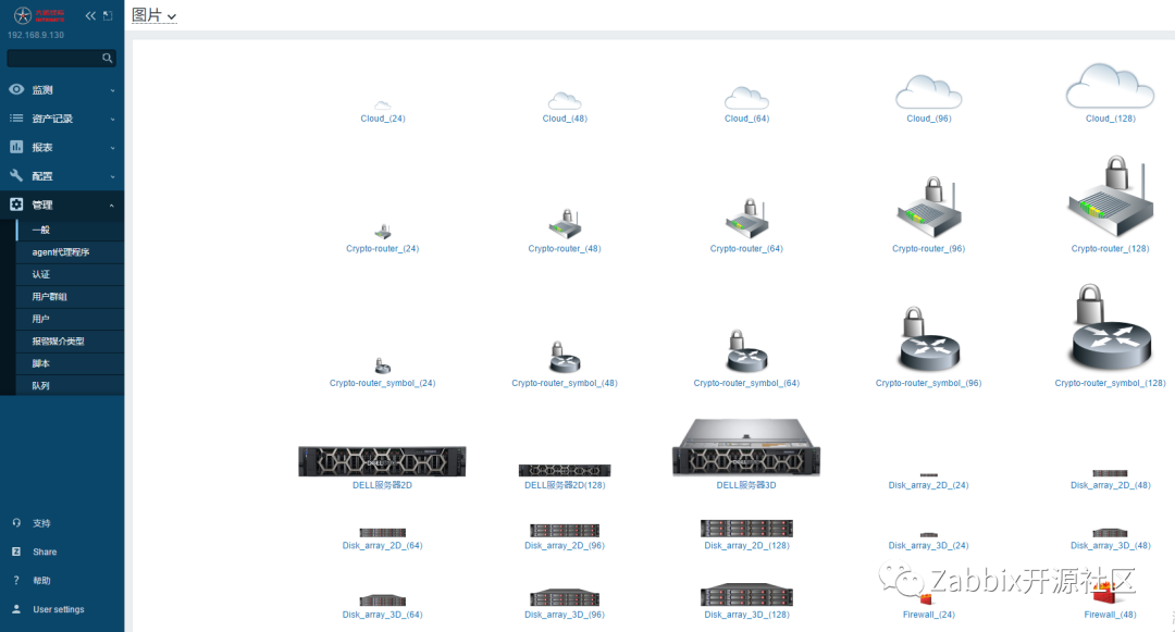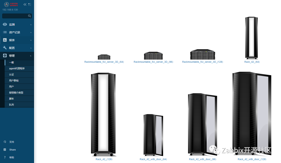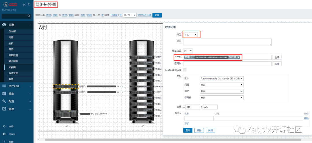 可利用上述图片制作“网络拓扑”。将服务器、交换机、存储图片放入机柜中,可视化展示设备的物理位置。操作如下:选择“主机”,连接到对应的服务器,此主机已经被监控到Zabbix中。示例中的被监控主机,是一台联想ThinkSystem SR650服务器,通过配置XCC远程管理中的Snmp方式实现了监控,这里我们选择128尺寸机柜图,并选择合适主机图标。