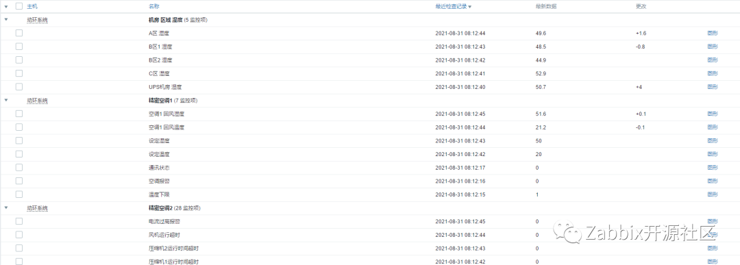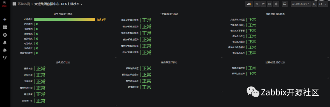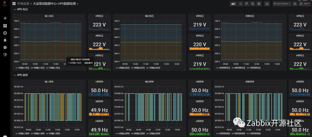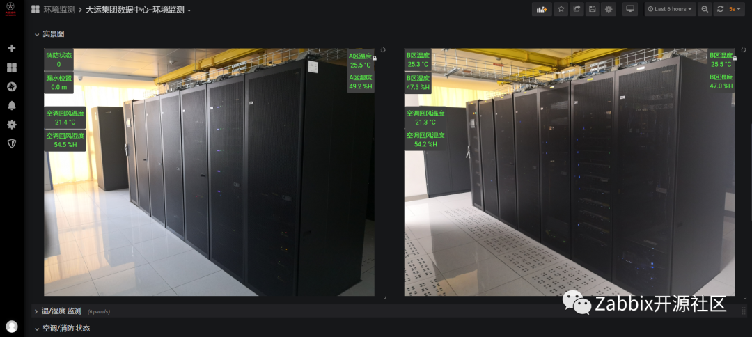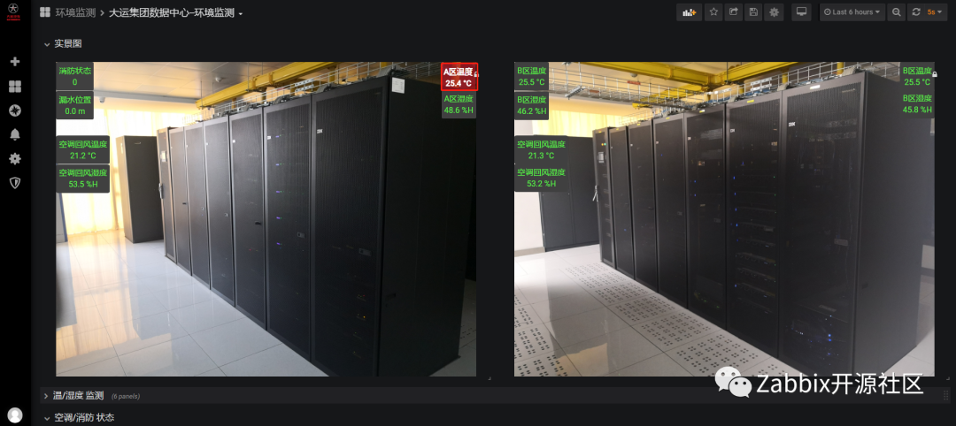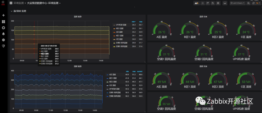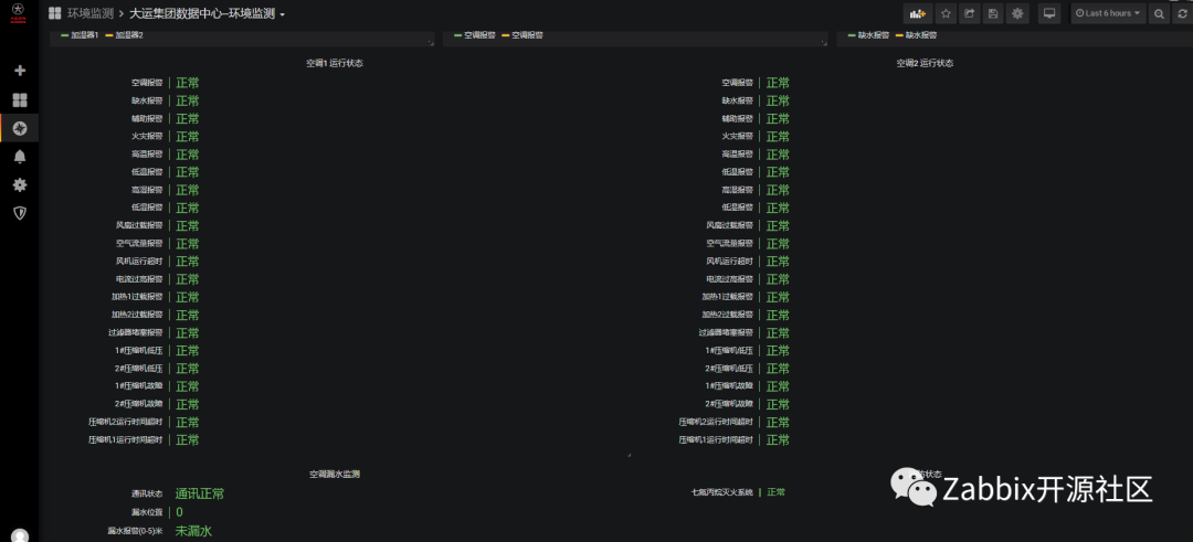 大运监控系统始终以Zabbix为主,数据采集和告警功能都在Zabbix上实现,通过Grafana上Zabbix插件调⽤Zabbix数据实现酷炫的可视化展示,少量采⽤MySQL插件编写SQL语句查询。机房动环使用Zabbix,采集结果如下图: