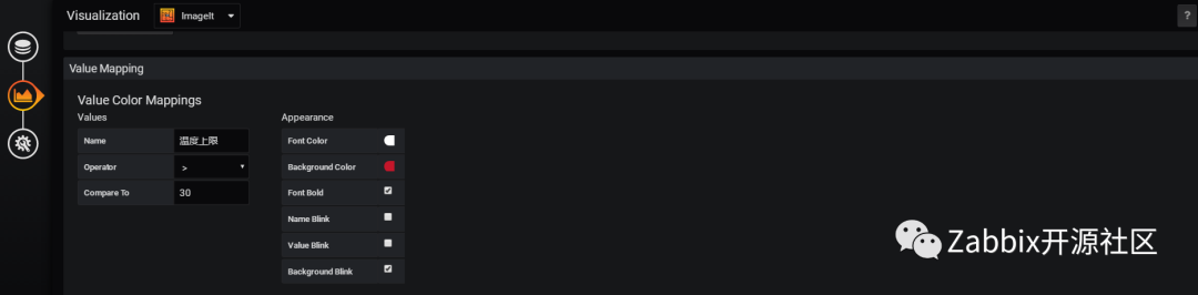 5 配置闪烁告警显示,告警名称“温度上限”,使用了 白字红底,底色闪烁。回到4中的图片 Value Mappings选择 “温度上限”。这样就实现了所谓的”数据上图“功能。