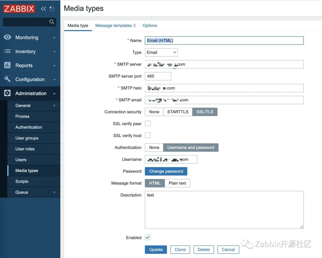 安装完成后,需要在web页面进行一定的配置,才能生成PDF报告。报告发送需要配置用户邮件媒介,其他媒介会无法发送,使用Zabbix 自带的邮件媒介,配置邮件服务器信息。