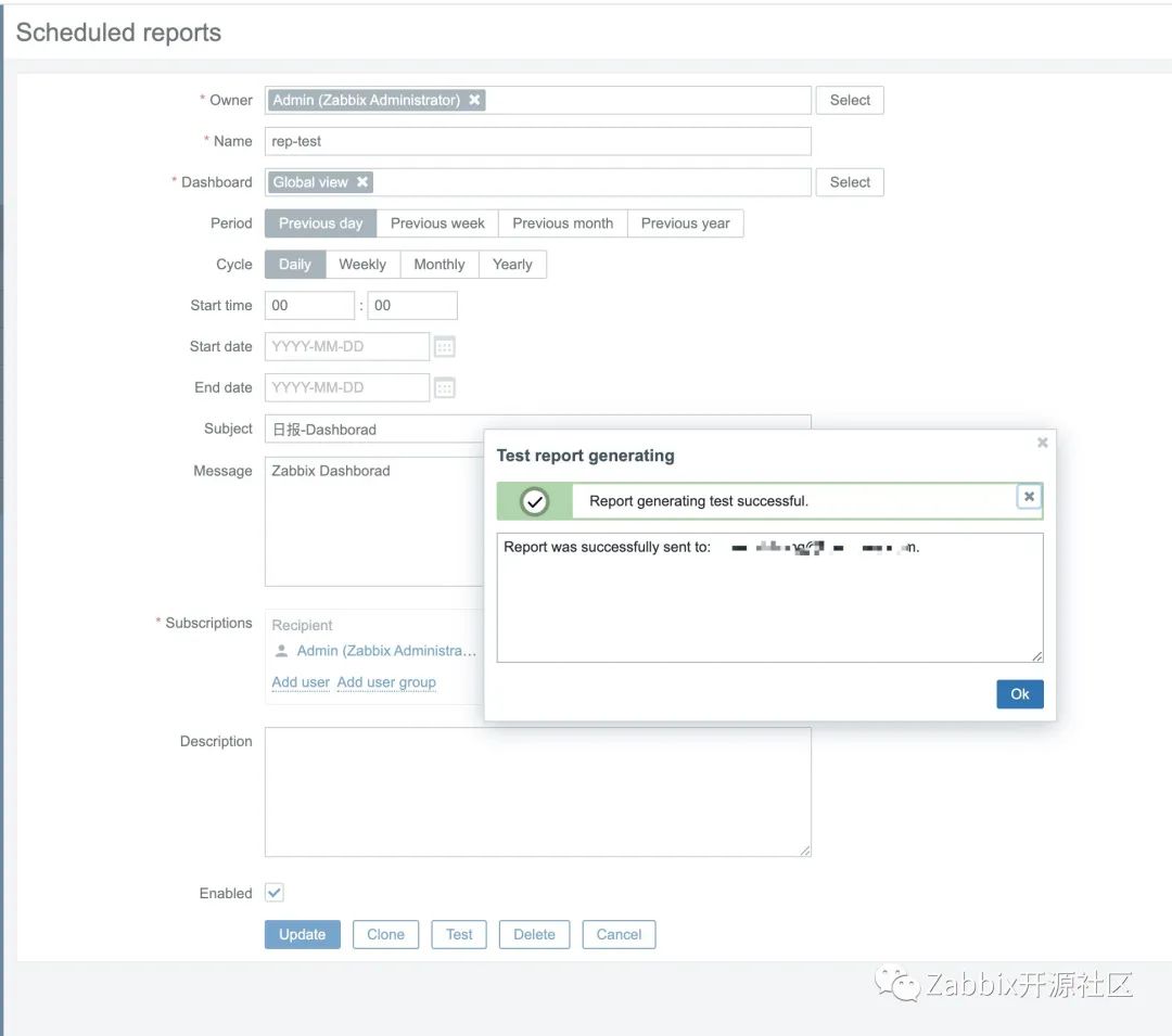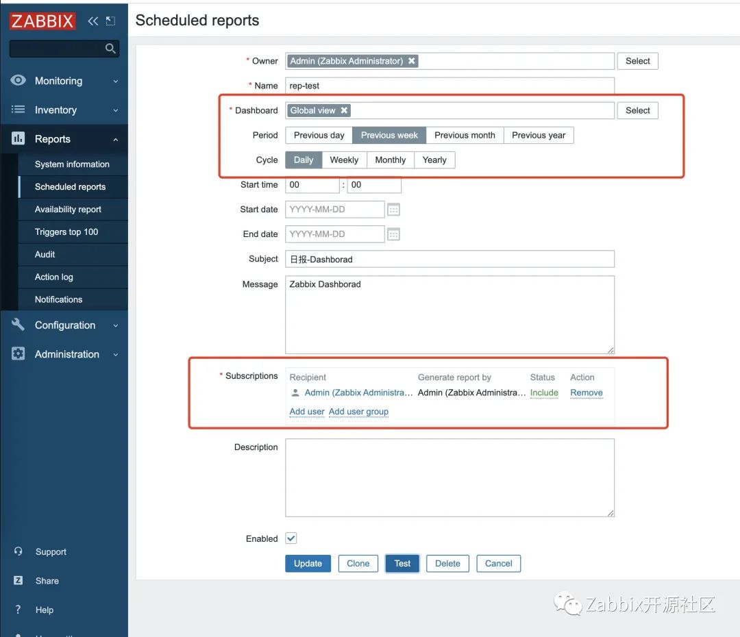 配置报告名称,Dashborad、发送时间、选定需要接受的用户或组。配置完成后点击Test测试。