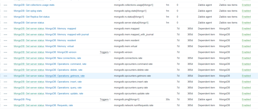 关于监控MongoDB模板的宏、发现规则,以及监控项触发器的说明可以参考官方说明https://www.zabbix.com/integrations/mongodb