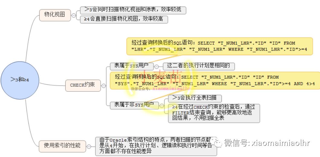 ① 在CHECK约束下,如果表属于非SYS用户,那么大于3会执行全表扫描;而大于等于4在经过CHECK约束的检查后,通过FILTER结束查询,能够更高效地返回结果,不用扫描全表。如果表属于SYS用户,那么这二者的执行计划是相同的。因为,若表属于非SYS用户,则最终经过查询转换后的执行SQL为:“SELECT "T_NUM1_LHR"."ID" "ID" FROM "SYS"."T_NUM1_LHR" "T_NUM1_LHR" WHERE "T_NUM1_LHR"."ID">=4 AND 4>4”,而若表属于SYS用户,则最终经过查询转换后的执行SQL为:“SELECT "T_NUM1_LHR"."ID" "ID" FROM "LHR"."T_NUM1_LHR" "T_NUM1_LHR" WHERE "T_NUM1_LHR"."ID">=4”,所以,在非SYS用户下,最终的执行计划中会有“filter(NULL IS NOT NULL)”的谓词条件。