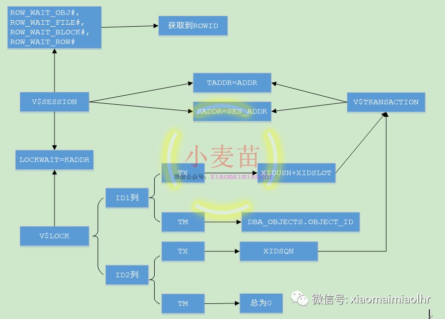所有与锁有关的数据字典视图之间的关联关系如下图所示: