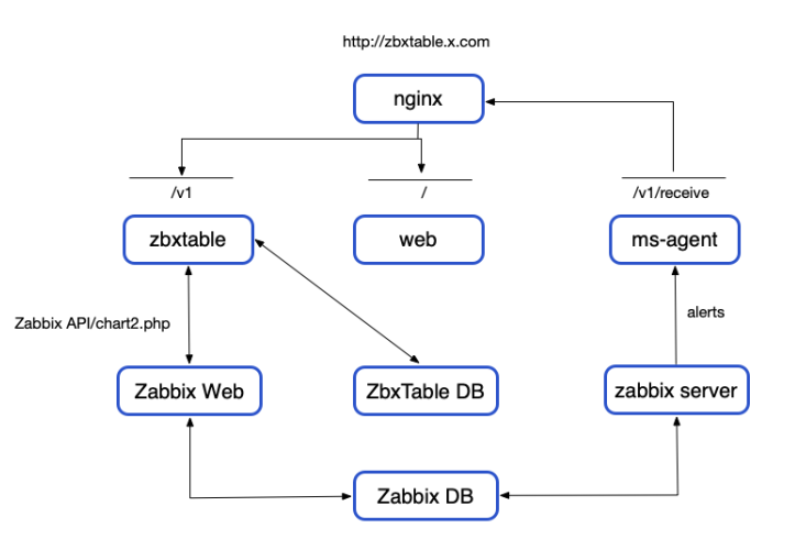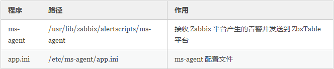 MS-Agent: 安装在 Zabbix Server 上,用于接收 Zabbix Server 产生的告警,并发送到 ZbxTable 平台
