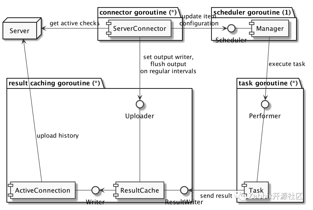 从Zabbix服务器接收项目配置后,ServerConnector更新其自己的数据并为每个提供相应指标的插件创建一个特定的updateRequest。通过通道将请求发送到Scheduler,然后Scheduler创建任务并将其放入队列。这样,插件将在完成分配给它的所有先前任务后启动这些任务。