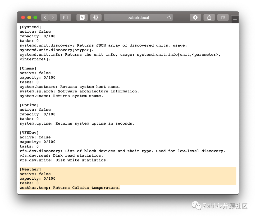 $ zabbix_agent2 -R metrics...[Weather]active: truecapacity: 0/100tasks: 0weather.temp: Returns Celsius temperature....