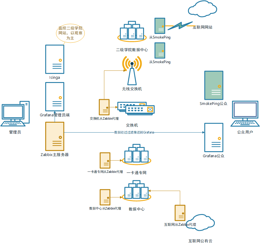 可以看框架图,部署是非常复杂的,为了安全,Zabbix使用主从模式部署,从代理服务器部入一卡通专网和互联网云平台。SmokePing可使用树莓派部署后到处乱丢,没有自动化部署工作量是非常巨大的,而且使用了自动化部署,也可以在不同地方复制,让其他闲人也可以参与进来。